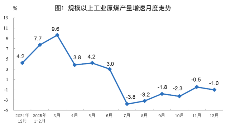 原煤产量稳中略降。12月份,规上工业原煤产量4.4亿吨,同比下降1.0%;日均产量1410万吨。