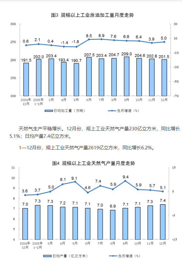 天然气生产平稳增长。12月份,规上工业天然气产量230亿立方米,同比增长5.1%;日均产量7.4亿立方米。