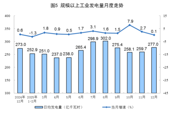 规上工业电力生产保持增长。12月份,规上工业发电量8586亿千瓦时,同比增长0.1%;日均发电量277.0亿